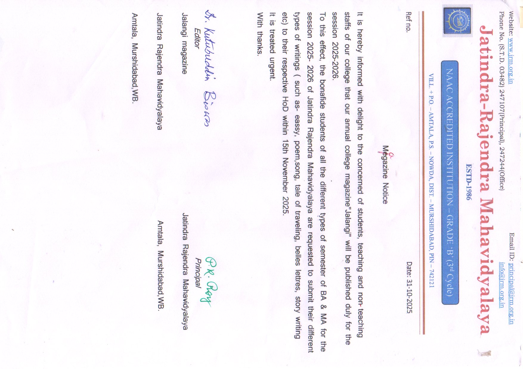 Murshidabad is historically, geographically and culturally a fertile land situated on the east of the river Ganga in West Bengal. Around the year 1986, the area of Nowda was a green isolated countryside with farming as the main occupation of the people. Rice, mustard and jute cultivation was the source of livelihood of the people of this area. The society was stratified, with education accessible only to the elite class of the village community. The education of the girls of the village was negligible. The population being largely Muslim, education was not encouraged among girls from this minority community who were married early. The social reformation started with the establishment of Amtala High School, a co-educational Institution where post-class VIII girl-students were married early as learning in the same classroom with the boys after adolescence was not encouraged in this conservative community. With this in mind, a girls’ school Annadamoni Balika Vidyalaya was established with the help of a few liberal intellectuals of the neighborhood. Very slowly, education among girls increased and the people of the area realized the necessity of education among all, especially among girls. Gradually there started an awakening among the village community. Simultaneously, there grew a slow fermentation among the village community for having a Higher Education Institute for continuation of the study of meritorious students of the schools of the area. With no college within almost 22 kms around the village of Amtala, the nearest railway station around 23 kms away and local transport being insufficient (only two buses plied up and down between Amtala and Berhampore throughout the day), the need for a college in this locality was felt throughout Nowda,Hariharpara, Karimpur and Tehatta along with Amtala. The college started with about 36 students, surprisingly girl-students comprising one-third of the class strength in 1986. The Board of members was led by Jayanta Biswas ...